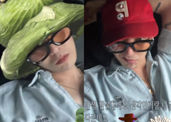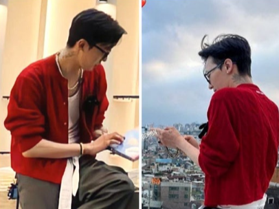 여자 옷도 찰떡 소화하는 지디. 플라워 자수 디테일이 예쁜 핑크색 가디건을 스트라이프 티와 매치, 힙스러운 그래니룩 완성. 손목에 리본 타이도 센스 넘치는 디테일.