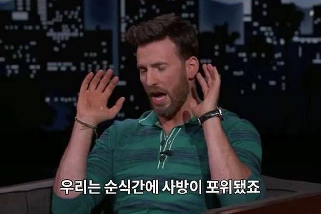 크리스 에반스는 "엄청 커다란 25~30명쯤 되는 남자분들이 모두 슈트를 입고 제 주위를 둘러싸 양쪽에서 제 손을 잡고 공항까지 데려다주셨다. 그런데 공항에 팬이 한 명도 없었다"고 말해 웃음을 자아냈습니다.