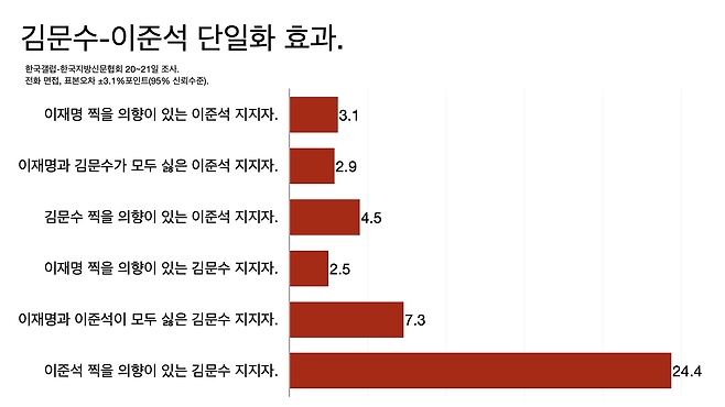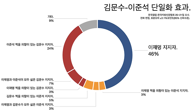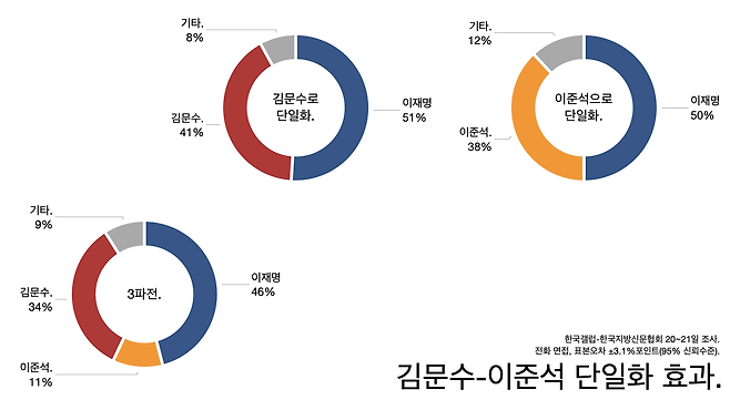 - 대략 다음 그림과 같은 모양이 되는데 [김문수로 단일화]와 [이준석으로 단일화]가 3%포인트 차이라 오차 범위 안이라고 할 수 있습니다.