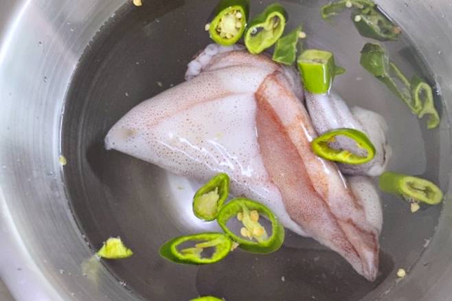 40도 온도의 물에 청양고추를 넣어주시면 되는데요. 방송에서 오징어 3마리 기준 청양고추 3개를 넣는데 저는 한 마리만 사용할 거라 청양고추 1개 정도 넣었습니다.