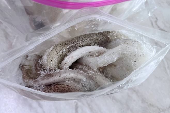 오징어는 3-4마리 한 번에 사서 냉동실에 한 마리씩 소포장해 얼려두는데요. 먹고 싶을 때 한 마리씩 꺼내 해동해 먹고 있어요