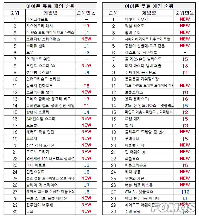 한편, 유료 게임 순위에서는 '지오메트리 대시'가 2위를 기록했으며 미스터리 어드벤처 게임 '언더그라운드 블라썸'이 13계단 크게 오르며 7위를 차지했다.