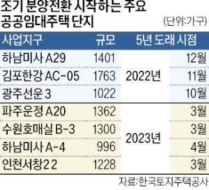 지역별로는 1401가구 규모의 경기 하남 미사강변효성해링턴플레이스NHF, 1763가구 규모의 김포 한강센트럴블루힐이 기준 임대 기간인 5년을 넘겨 가장 먼저 조기 분양전환 계약 절차에 들어갈 전망이다. 경기 광주 선운리버프라임(1022가구)과 파주 운정 산내2센트럴리움(1362가구) 등도 기간을 넘겼다.