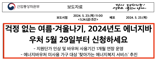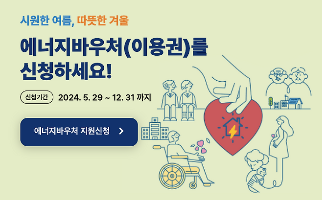 에너지바우처 지원 대상 여부가 궁금하다면 가까운 거주지 행정복지센터, 에너지바우처 콜센터(☎1600-3190) 또는 복지로 사이트(www.bokjiro.go.kr)맞춤형 급여안내 서비스 등을 통해 확인할 수 있습니다. 2024년 에너지바우처 신청은 5월 29일부터 12월 31일까지이며, 주민등록상 거주지 읍‧면‧동 행정복지센터에 방문하여 에너지 이용권 발급 신청서를 작성하여 제출하면 됩니다. 사회보장급여 신규 신청자도 에너지바우처를 함께 신청할 수 있으니, 관할 행정복지센터에서 확인 바랍니다.