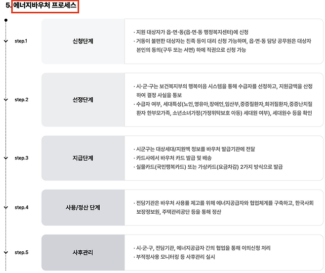 행정복지센터에 방문이 어려운 경우, 친족이나 법정대리인을 통한 대리 신청, 지자체 공무원의 직권 신청, 복지로 사이트 온라인 신청도 가능합니다. 작년 에너지바우처 수급자 중 주소, 세대원 등의 정보 변동이 없다면 별도 신청 없이 자동으로 갱신됩니다. 다만, 정보 변동이 있는 경우에는 행정복지센터에 재신청해야 합니다.
