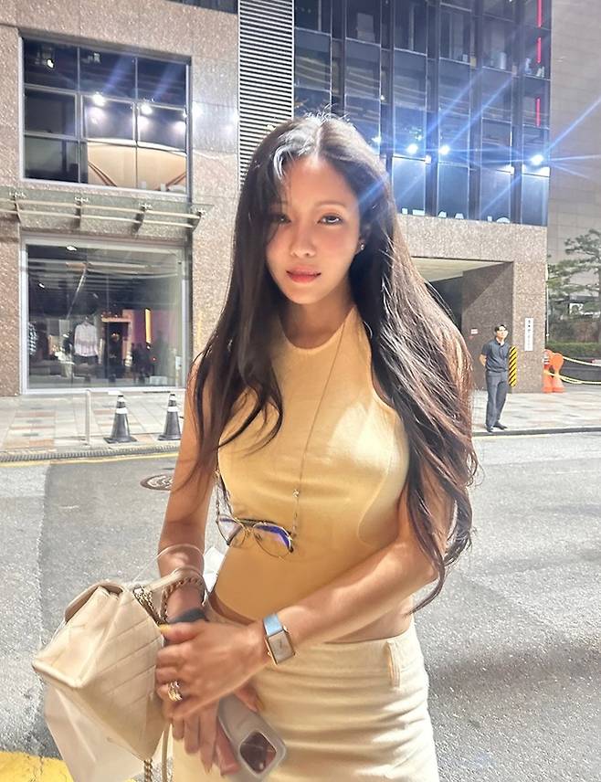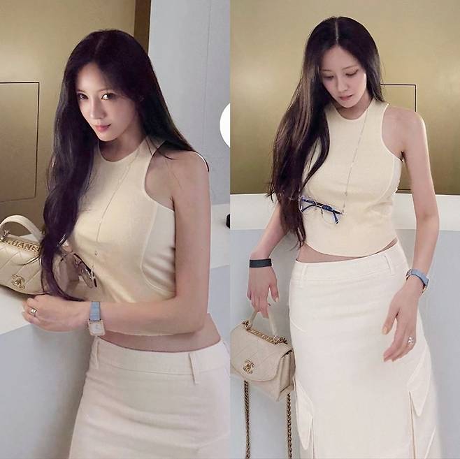 공개한 사진에서 효민은 S라인 몸매와 복근이 드러난 밀착 민소매 크롭톱과 카고 롱 스커트를 매치한 나들이룩으로 은근한 볼륨 미모를 자랑했다.