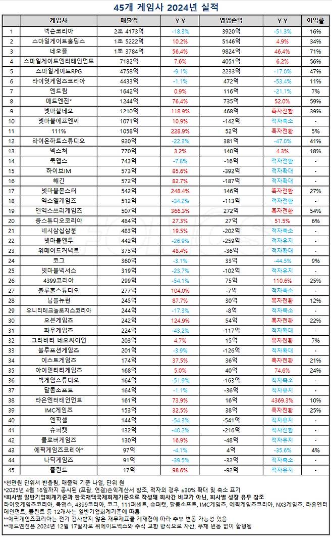 반면, 기존 게임의 자연 감소세 속에서 신작 출시를 준비하는 개발사는 부진했다. '아키에이지 워'를 선보였던 엑스엘게임즈는 다시 적자로 돌아섰고 '바람의 나라: 연' 개발사인 슈퍼캣도 216억 원의 적자를 냈다. '오딘: 발할라 라이징' 개발사인 라이온하트스튜디오도 영업이익이 47% 줄어들었다.