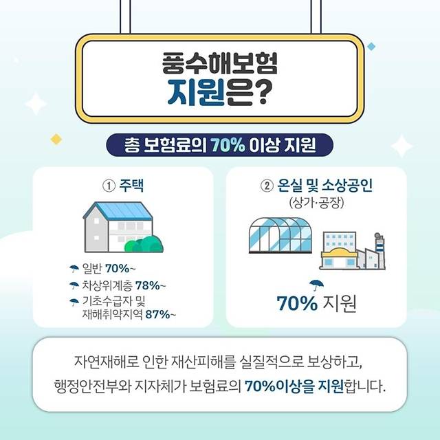 행정안전부가 관장하고 민영보험사가 운영하는 정책보험인 풍수해보험은 국민들이 예기치 못한 자연재해에 대해 저렴한 비용으로 스스로 대처할 수 있도록 지원하는 선진국형 재난관리 제도입니다. 이 보험은 국가와 지자체에서 보험료의 70-100%를 지원하여 가입자가 부담하는 금액은 8-30%에 불과합니다.