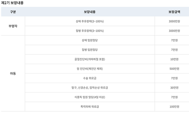 가입 자격은 만 13세 미만의 아동을 양육하는 한부모가정 중 아동양육수당을 받는 가정과 그 보호자입니다. 이전 저소득아동보험2(1기)의 경우 만 17세 미만 아동과 그 보호자가 대상이었습니다. 주요 혜택으로는 입원, 외래, 약제비 등 의료비 지원과 건강검진, 예방접종 등 건강관리 서비스가 제공됩니다. 자세한 내용은 서민금융진흥원(대표전화 1397) 홈페이지(https://kinfa.or.kr)에서 확인할 수 있습니다.