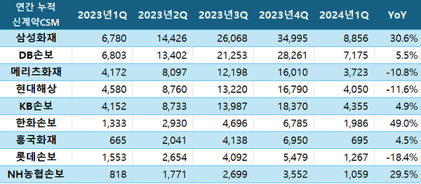 실제로 메리츠화재는 높은 당기순이익 대비 신계약 CSM이 낮은 편이다. 올해 1분기 메리츠화재의 신계약 CSM은 3723억원으로 오히려 전년동기대비 10.6% 감소했다. 그럼에도 같은 기간 기말 CSM은 11.4% 늘어난 10조7427억원을 기록했다.