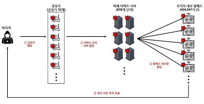A씨는 2021년 8월부터 같은 해 11월까지 A·B업체가 제작한 월패드를 사용하는 아파트 단지를 해킹 대상으로 정한 뒤 전국 638개 아파트 단지 내 월패드를 중앙관리하는 서버와 각 아파트 세대(40만4847개 가구)에 설치된 월패드를 차례로 해킹해 권한을 얻었다.