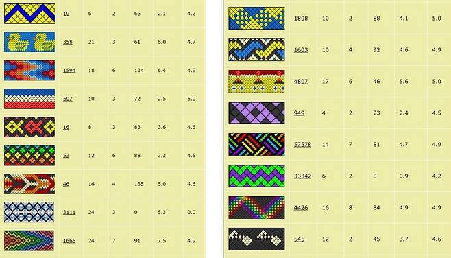 그렇다면 어떤 모양으로 땋아야 할까. 포털사이트를 통해 ‘프렌드십 브레이슬릿(friendship-bracelets)’ 홈페이지에 접속하면 다양한 종류의 미산가 도안을 구할 수 있다. 일정 패턴이 반복되는 도안이 있는가 하면 이니셜 등 원하는 모양을 넣을 수 있는 도안도 있다. 복잡하고 다양한 패턴이 들어갈수록 난이도는 높아진다.