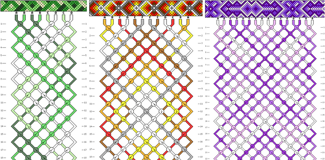 원하는 색을 도안처럼 배치하면 팔찌를 만들 준비는 끝난다. 제작시 가장 중요한 것은 도안 속 원형 안에 있는 기호다. 해당 기호는 땋는 방향을 뜻하는데 ‘↘’는 땋은 실이 오른쪽에 위치해야 한다는 의미이며 ‘↙’는 땋은 실이 왼쪽에 위치해야 한다는 의미다. 꺾인 화살표들은 땋은 실의 위치가 바뀌지 않고 원래의 위치로 가야한다는 것을 의미한다. 대부분 이 4종류의 땋기법이 사용된다.