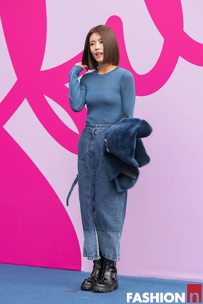 이날 이윤지는 숏컷 헤어 스타일에 데님 롱 스커와 블루 티셔츠를 입고 손에 파란색 재킷을 손에 든 패션쇼 나들이룩으로 청청 패션의 진수를 선보였다.
