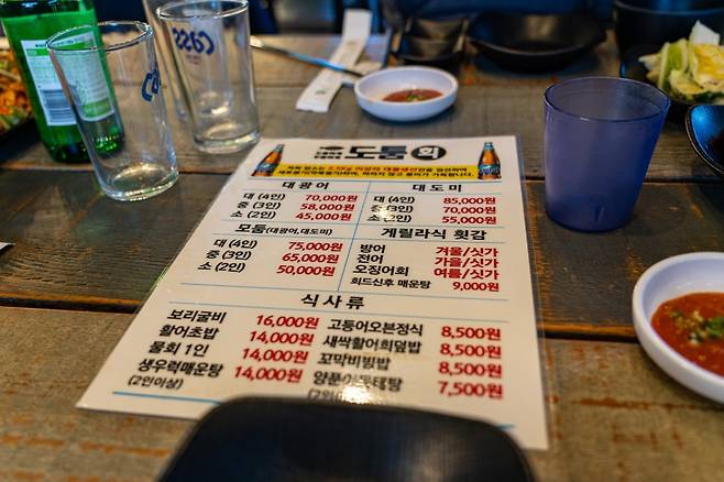 반찬으로 나오는 백김치가 개인적으로 아주 입맛에 맞았다. 두 번이나 리필해서 먹을 정도로 맛있었다. 혹자들 입에는 좀 달게 느껴질 수도 있다. 여기는 좀 달달한 백김치라는 점은 분명히 한다. 강남 지역에서 모임으로 회를 먹는다면 넓은 공간을 가진 도톰횟집을 추천할 만하다.