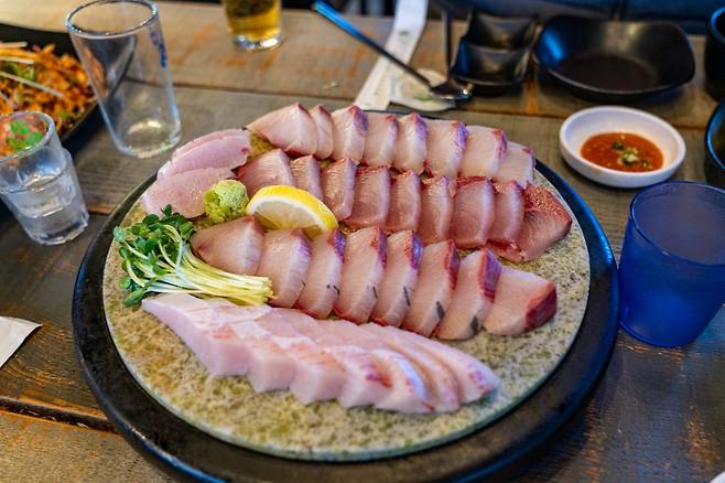 대부분의 횟집은 대방어가 겨울 한정 상품이기 때문에 시가로 표시된다. 그런데 메뉴판에는 가격이 없다. 그래서 얼마냐고 물어보니 대도미 가격이 대방어 가격과 같다고 한다. 2025년 2월 현재 3인용 중자가 7만 원이다. 강남이라고 해도 나쁜 가격은 아니다. 물론 나오는 폼새를 봐야 하겠지만. 잠시 후 등장한 대방어 중자 한 판. 오호라 괜찮다. 회의 두께도 이름만큼이나 도톰하다. 방어회의 부위들도 괜찮고, 신선하니 맛도 아주 괜찮았다. 만족. 아니 대만족.