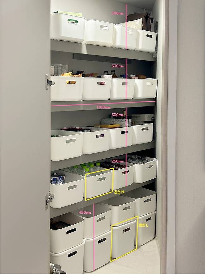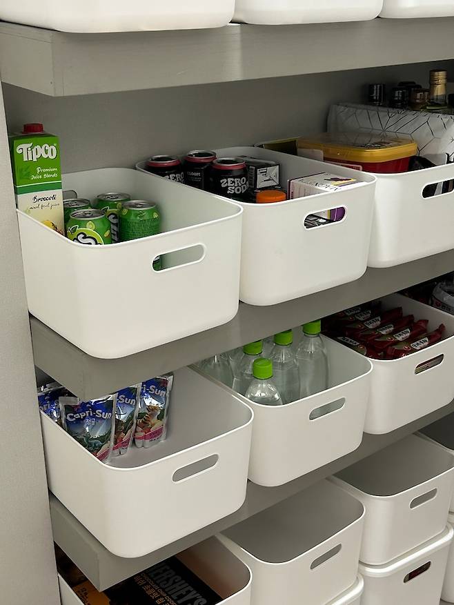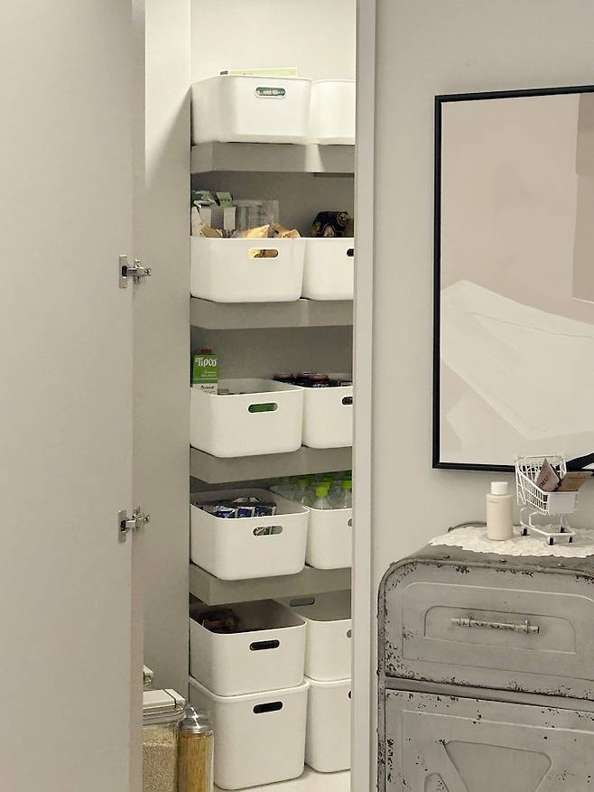 평소 저는 컬러를 좋아하는데 팬트리 공간이 워낙 작기 때문에 화이트로 수납함을 통일해서 깔끔하게 보이도록 강조했어요.