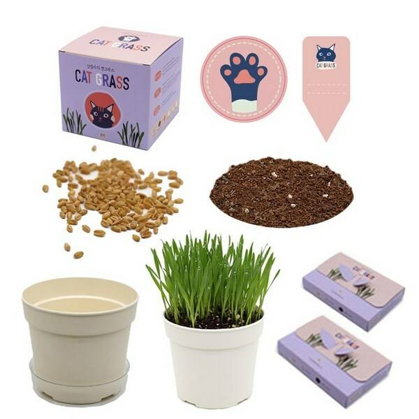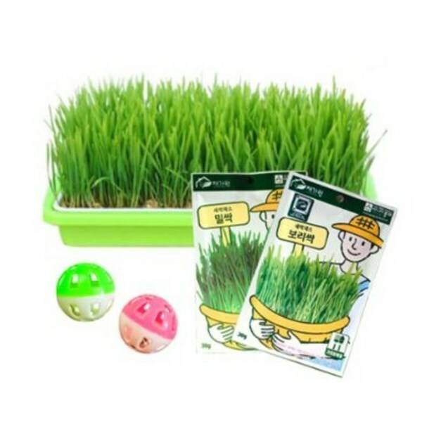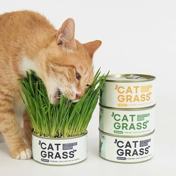 화분으로 식물을 키우기 힘든 집사님이라면, 캔으로 된 캣그라스 키우기 세트를 구매해도 좋아요. 이 제품은 보리와 귀리, 밀 세트로, 처음에 물을 부은 뒤 싹이 자라면 조금씩 물만 뿌려주면 된답니다.