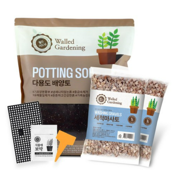 가드닝 제품이 하나도 없다면, 이 제품을 추천해요. 화분 바닥에 까는 깔망부터 화분, 흙까지 세트로 들어있어, 분갈이할 때 편리하답니다.