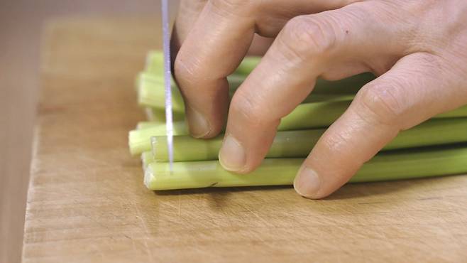 가장 먼저 마늘쫑을 준비하세요. 그리고 마늘쫑 끝 부분을 잘 맞추세요. 이제 끝 부분을 아주 조금만 잘라 버리세요.
