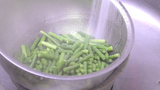 찬물에 3번 정도 씻어낸 마늘쫑은 소쿠리에 담아 물기를 빼주면 됩니다.