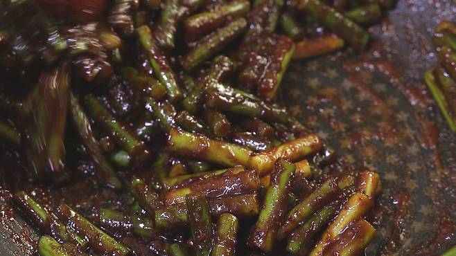 1~2분간 마늘쫑을 계속해서 볶으세요. 간이 밸 정도로만 볶는 것이 좋아요. 너무 오랫동안 볶으면 식감이 물러질 수 있어요.