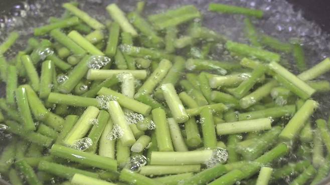 그리고 준비한 마늘쫑을 20초 정도 짧게 데치세요. 만약 너무 오랫동안 데치게 될 경우, 식감이 물러질 수 있으니 주의하세요.