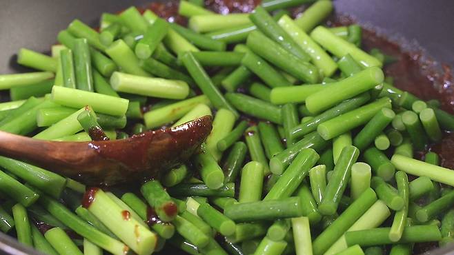 양념장이 끓어올랐을 때, 불을 중 약불로 줄이세요. 그리고 마늘쫑을 넣으세요.