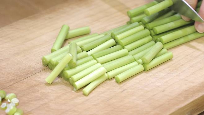 그리고 한입에 먹기 좋은 길이로 일정하게 잘라 준비하세요. 꽃봉오리 부분이 있다면 따로 사용하지 않고 버렸답니다.