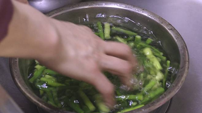 건져낸 마늘쫑은 바로 찬물에 샤워를 시키세요.