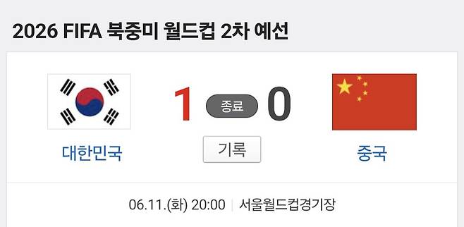 2026 FIFA 북중미 월드컵 2차 예선 한국vs중국