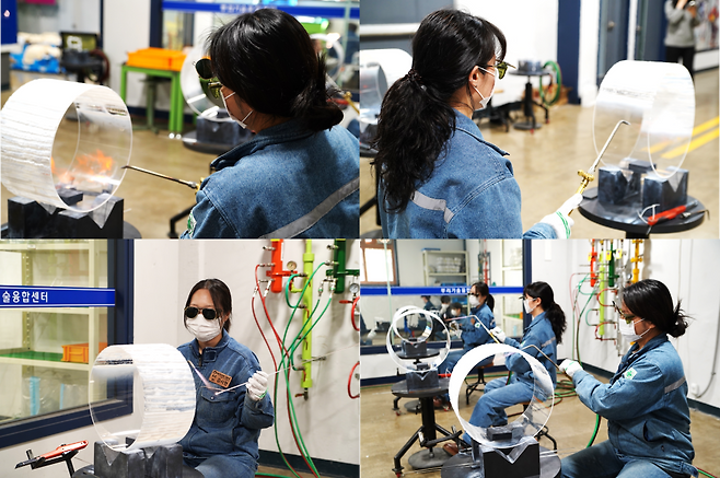 (김혜린) “피복아크용접은 용접봉을 사용해 동일한 금속끼리 합치는 용접 방법입니다. 처음에 철판에 용접봉이 달라붙어서 애먹었습니다. 용접 환경이 아주 뜨거워 화상의 우려도 있습니다. 용접하다가 옆에 있던 비닐에 스파크가 튀어서 깜짝 놀란 적이 있어요.”