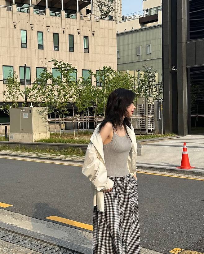 화이트 셔츠는 자연스러운 구김마저 스타일로 소화하며, 루즈한 핏으로 편안한 무드를 자아낸다. 안에는 그레이 슬리브리스를 매치해 캐주얼한 포인트를 더했고, 하의로는 블랙&화이트 체크 팬츠를 선택해 룩에 잔잔한 패턴감을 부여했다. 전체적으로 톤 다운된 컬러 조합이 안정감을 주며, 외출보다는 한적한 오후의 감성을 담아낸 듯한 인상이 깊다.