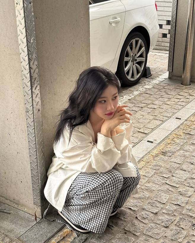 콘크리트 기둥에 기댄 채령의 모습이 눈길을 끈다. 바람이 스치는 듯한 내추럴 헤어와 깊은 눈매, 그리고 헐렁한 박시 셔츠 스타일링이 그녀만의 차분한 분위기를 극대화한다. 심플하면서도 멋스러운 셔츠와 체크 팬츠 조합은 데일리룩의 정석이라 할 수 있다.