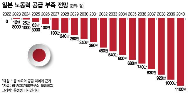 한국보다 일찍 고령화 사회에 진입한 일본의 인력 부족 현상이 가속할 것이라는 우려가 커지고 있다. 2040년에는 1100만명분의 노동력이 부족할 것이라는 전망이 나왔다. 일본 경제를 지탱할 힘이 그만큼 약화한다는 의미다. 저출생·고령화 문제의 심각성을 인지한 기시다 후미오 일본 정부는 대책 마련에 총력을 기울이고 있다.