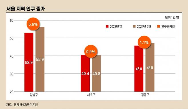다음 표는 2022년 12월부터 올해 9월 말까지 1년 9개월 동안 서울에서 인구가 늘어난 주요 지역이다. 이 기간 동안 서울의 인구는 0.8%나 줄어들었지만 서초구는 0.9% 증가했고 강동구도 1.1%나 증가했다. 놀라운 것은 강남구는 무려 5.6%나 증가했다.