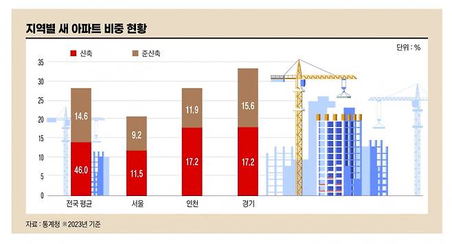 경기도는 전체 아파트에서 새 아파트의 비율이 32.8%(신축 17.2%, 준신축 15.6%)로 전국 평균치를 크게 상회한다. 인천 역시 새 아파트의 비율이 29.1%(신축 17.2%, 준신축 11.9%)로 전국 평균치 이상이다. 전국에서 세종시 다음으로 신축 비중이 높은 지역이 경기도와 인천이다.
