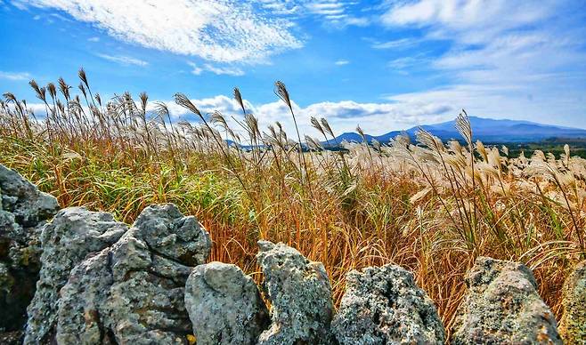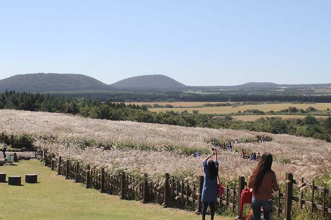 제주의 푸른 하늘, 은빛 억새, 독특한 화산지형이 만들어내는 조화는 이곳에서만 경험할 수 있는 특별한 매력이라 할 수 있습니다.