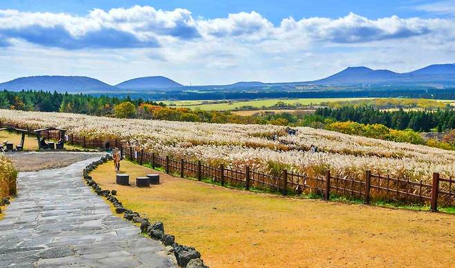 매표소를 지나 입구 건물을 지나면 오름을 빙 둘러 이어진 탐방로가 나오고, 이 길을 따라 걷다 보면 사람 키보다 큰 억새가 드넓게 펼쳐진 풍경을 마주할 수 있습니다.