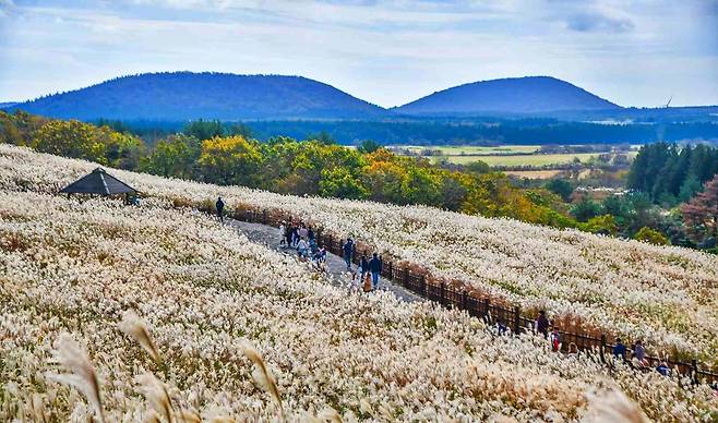가을 시즌에 한 번도 안 가본 사람은 있어도, 한 번만 가본 사람은 없다는 말이 있을 정도로 인기 있는 곳으로 10월이면 은빛 억새가 분화구 주변을 가득 메워 장관을 이룹니다.