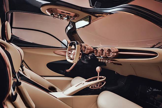 실내는 상당히 클래식한 모습이다. 각종 게이지가 아날로그로 되어 있으며, 마치 명품 시계를 연상케 하는 모습이다. 조작 버튼도 심플하게 몇가지 없는 모습이다. 시트는 카본과 가죽 재질로 제작되었으며, 센터콘솔에는 수동 기어가 적용되어 있다. 또한 전체적으로 브라운/카본 투톤 컬러로 이루어져 있다.