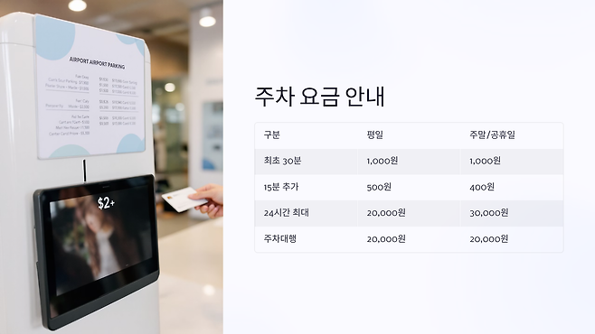 주차대행 (발레파킹): 차량을 직접 주차할 필요 없이, 공항에서 바로 맡기고 찾을 수 있어 편리합니다.
