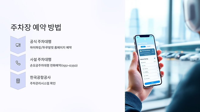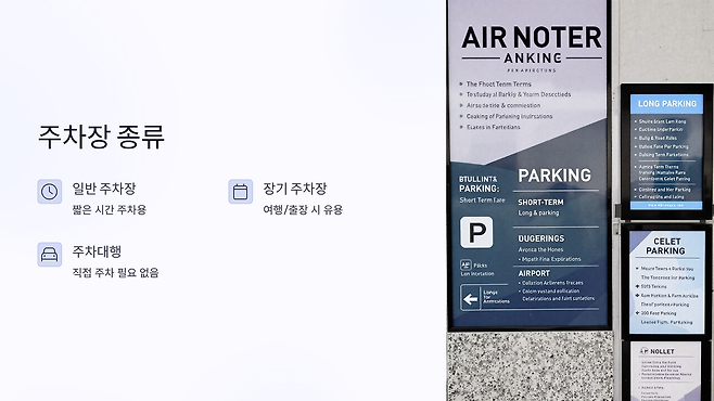 주차대행 (발레파킹): 차량을 직접 주차할 필요 없이, 공항에서 바로 맡기고 찾을 수 있어 편리합니다.