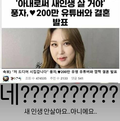 7월 27일, 풍자는 자신의 SNS를 통해 "'아내로써 새인생 살 거야' 풍자, ♥200만 유튜버와 결혼 발표"라는 제목의 가짜 뉴스 기사를 공유했다. 이에 대해 풍자는 "네? 저 아니에요"라고 짧게 언급하며 "새 인생 안 살아요"라고 덧붙여 해당 소식이 전혀 사실이 아님을 분명히 했다.