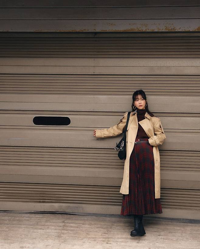 사진 속 기은세는 블랙 터틀넥 티를 입고 블랙과 레드가 있는 체크무늬 롱 스커트를 입고 버버리 코트를 걸쳐 가을무드를 자랑했다.