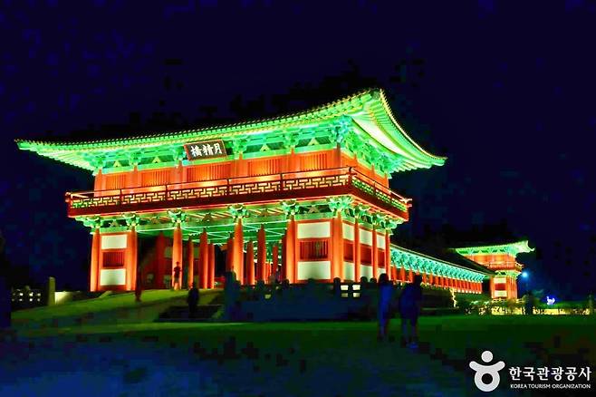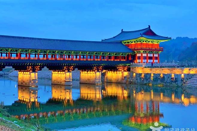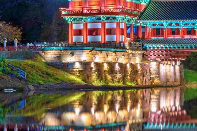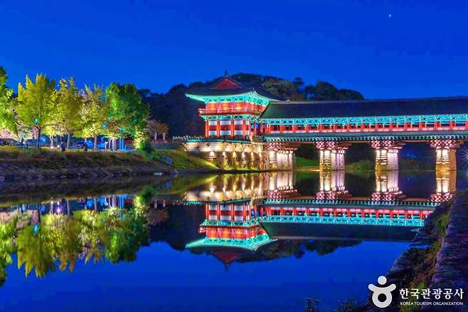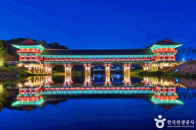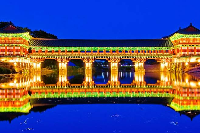 월정교는 경상북도 경주시 남천 위에 복원된 신라시대 목교다. 조선 시대에 소실됐다가 최근 원형에 가깝게 복원되어 2018년부터 일반에 공개됐다. 낮에도 아름답지만, 밤이 되면 교각과 누각에 조명이 들어오며 전통 건축미가 한층 도드라진다. 특히 붉은 조명과 목재 난간이 물 위에 반사되며 ‘물속의 월정교’라는 별칭도 생겨났다.