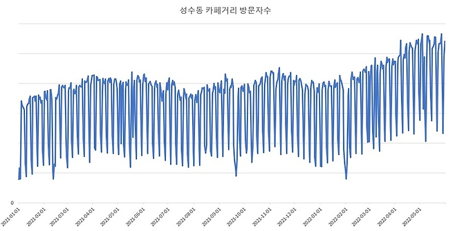 지난 1년 반 동안의 성수동 카페거리의 유동인구를 함께 보실까요?