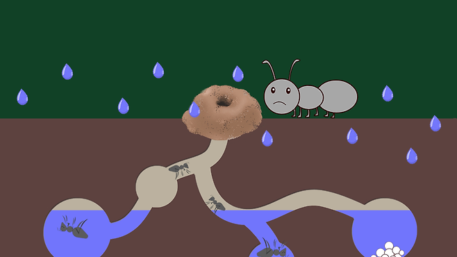 그런데 의문이 생깁니다. 앞서 개미집에는 들어가는 구멍이 존재했습니다. 즉, 문이 없어서 외부와 바로 연결된 상태입니다. 만약 비가 오면 저 구멍 안으로 빗물이 들어가게 될 텐데, 그러면 개미집은 물에 잠기지 않을까요?