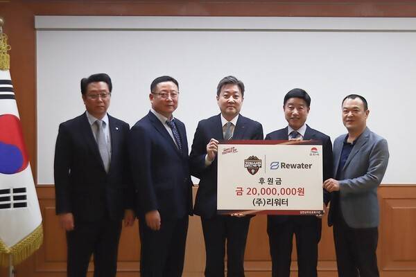 김천상무프로축구단이 6월 9일, 김천시청에서 (주)리워터의 후원금 전달식을 진행했다. 행사에는 김천상무 배낙호 구단주, 이재하 대표이사, 여영각 후원회장과 (주)리워터 김인석 대표이사, 김동국 경상권지사장, 이찬호 소장이 참석했다.