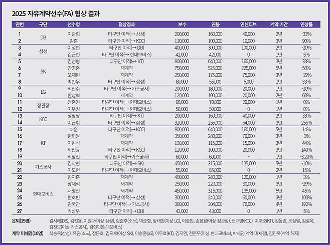 KBL 출범 후 FA 시장에 소용돌이가 일어난 연도를 돌아보면, 대부분 진원지는 KCC였다. 2025년도 마찬가지였다. 허훈을 영입하며 ‘슈퍼팀’ 라인업에 방점을 찍었다. 샐러리캡 포화, 역할 배분 등의 문제로 이승현과 전준범을 현대모비스에 넘겨줬지만, 허훈 영입을 구상할 때부터 어느 정도 염두에 둔 출혈이었다.